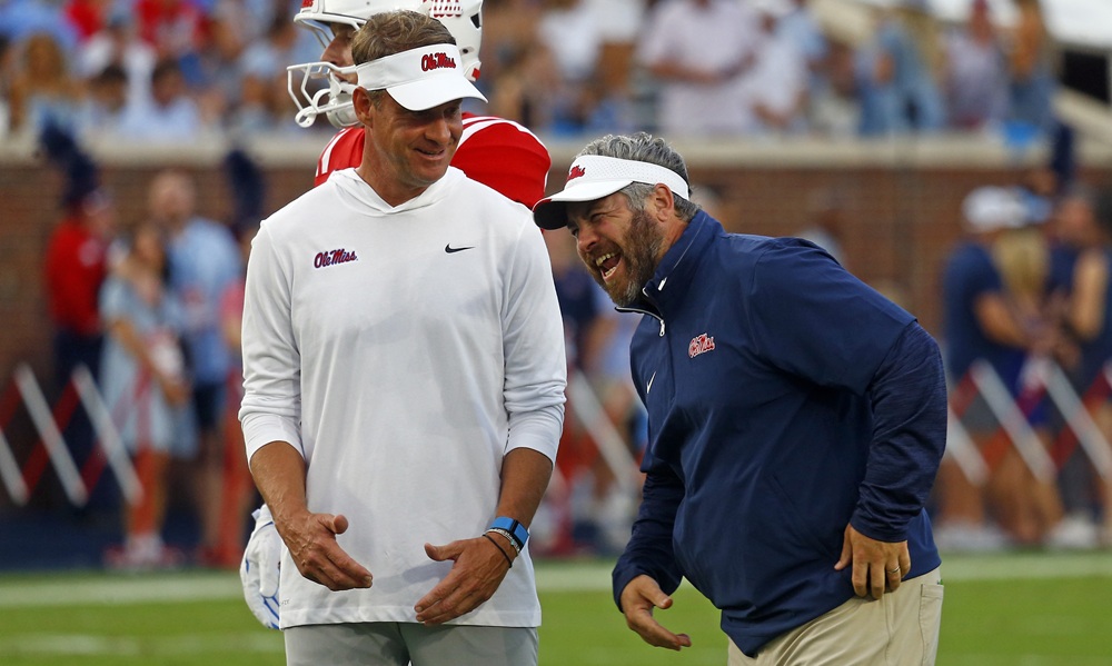 Sep 21, 2024; Oxford, Mississippi, USA; Mississippi Rebels head coach Lane Kiffin (left) shares a laugh with defensive coordinator Pete Golding (right) during warm ups prior to the game against the Georgia Southern Eagles at Vaught-Hemingway Stadium. Mandatory Credit: Petre Thomas-Imagn Images
