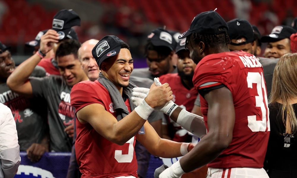 Dec 4, 2021; Atlanta, GA, USA; Alabama Crimson Tide quarterback Bryce Young (9) celebrates with linebacker Will Anderson Jr. (31) after their win during the SEC championship game after the Georgia Bulldogs at Mercedes-Benz Stadium. Mandatory Credit: Jason Getz-USA TODAY Sports