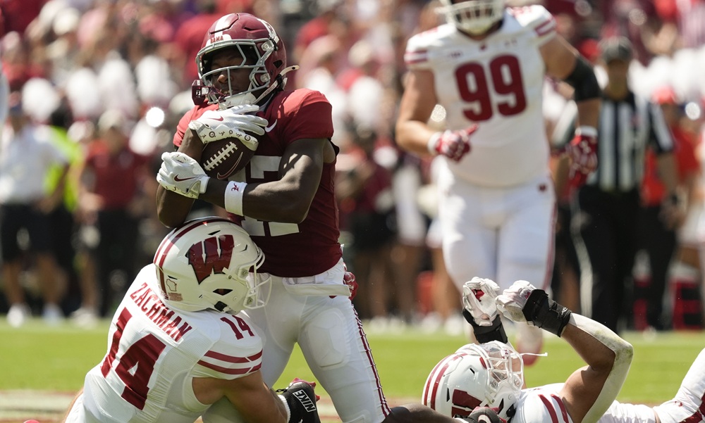 Sep 13, 2025; Tuscaloosa, Alabama, USA; Alabama wide receiver Lotzeir Brooks (17) is tackled by Wisconsin defensive back Preston Zachman (14) and Wisconsin linebacker Tackett Curtis (4) at Saban Field at Bryant-Denny Stadium. Mandatory Credit: Gary Cosby-USA TODAY Network via Imagn Images