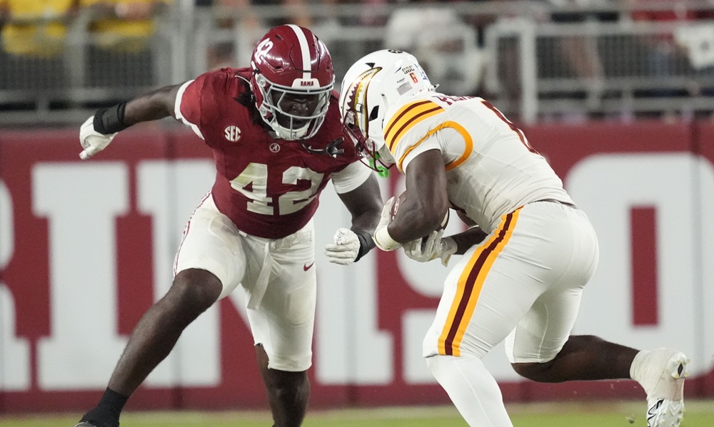 Yhonzae Pierre is the Crimson Tide’s starting wolf linebacker, which is a hybrid edge rusher and linebacker within Kane Wommack’s 4-2-5 scheme. Pierre is a product of Eufaula High School in Alabama, and he is the younger cousin of former Alabama linebacker, Courtney Upshaw.