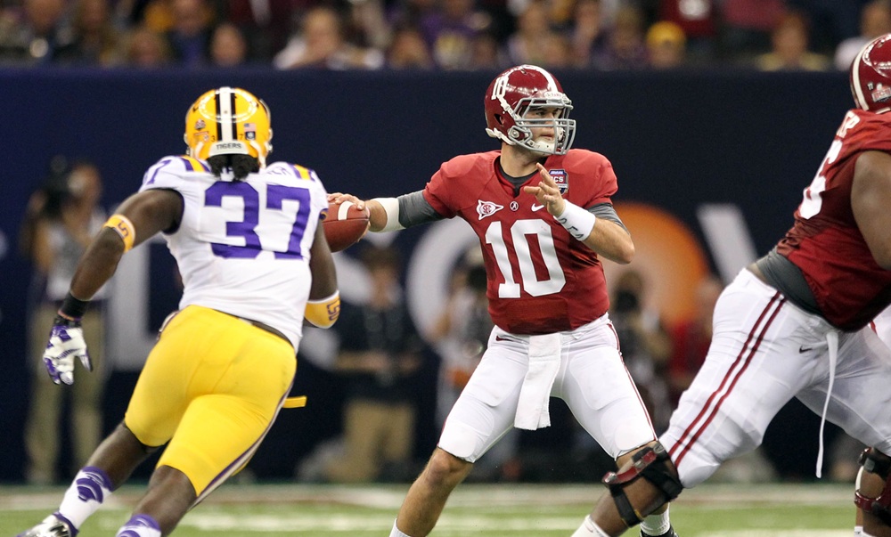 Jan 9, 2012; New Orleans, LA, USA; Alabama Crimson Tide quarterback A.J. McCarron (10) throws the ball as he is pressured by LSU Tigers linebacker Karnell Hatcher (37) during the first half of the 2012 BCS National Championship game at the Mercedes-Benz Superdome. Mandatory Credit: Matthew Emmons-Imagn Images