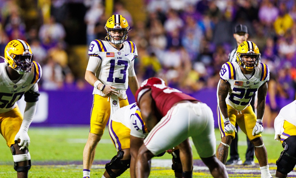 Nov 9, 2024; Baton Rouge, Louisiana, USA; LSU Tigers quarterback Garrett Nussmeier (13) looks over the Alabama Crimson Tide defense during the second half at Tiger Stadium. Mandatory Credit: Stephen Lew-Imagn Images
