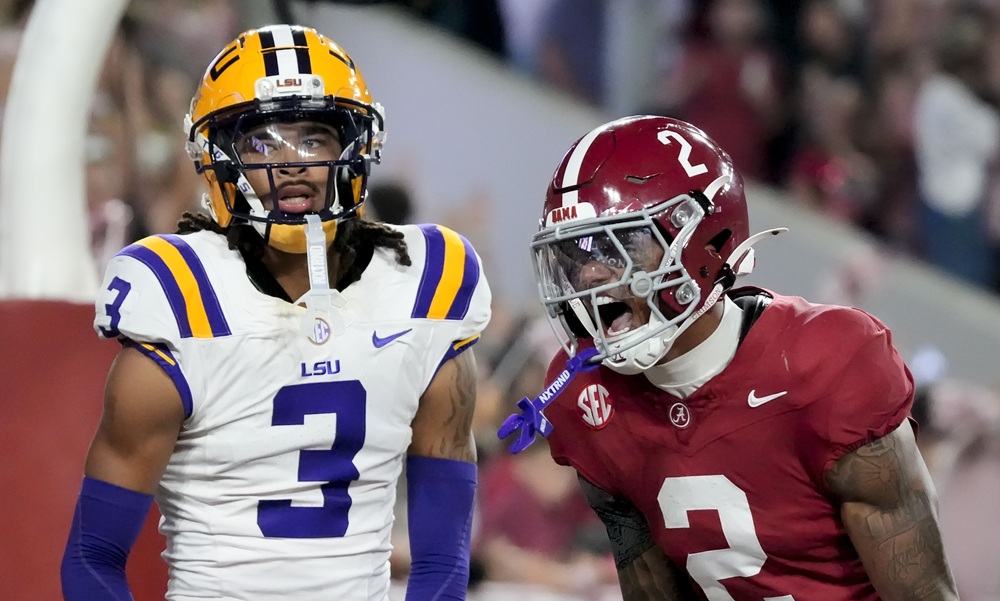 Nov 8, 2025; Tuscaloosa, Alabama, USA; Alabama wide receiver Ryan Williams (2) celebrates his touchdown catch in front of LSU defensive back DJ Pickett (3) at Saban Field at Bryant-Denny Stadium. Mandatory Credit: Gary Cosby Jr.-Imagn Images