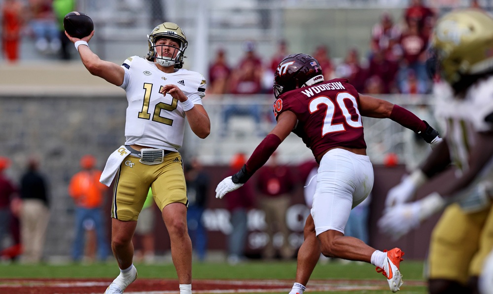 Oct 26, 2024; Blacksburg, Virginia, USA; Georgia Tech Yellow Jackets quarterback Aaron Philo (12) throws a pass against Virginia Tech Hokies linebacker Caleb Woodson (20) during the fourth quarter at Lane Stadium. Mandatory Credit: Peter Casey-Imagn Images