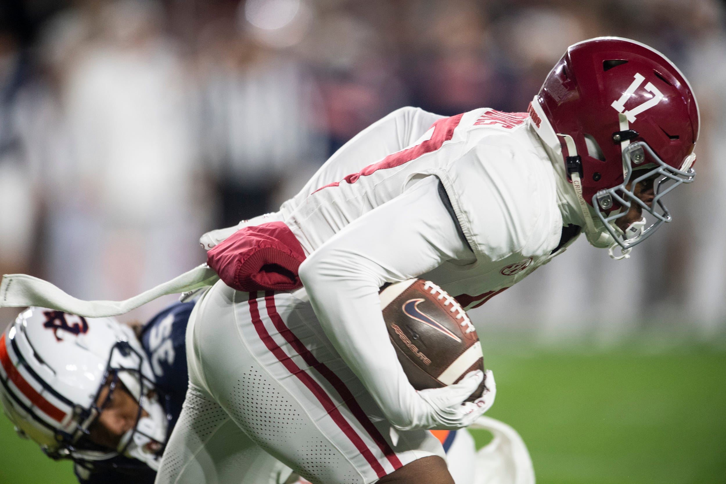 Brooks displayed his high ceiling during Alabama’s playoff win at Oklahoma when he recorded a season-high five receptions for 79 yards and a pair of touchdowns. At his best, the dynamic receiver is reminiscent of former Tide standout Jaylen Waddle, who donned the same No. 17 jersey.